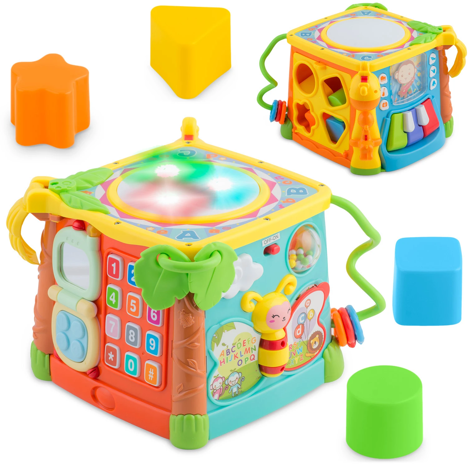 Cubul are multe elemente mobile , diferite tipuri de roti dintate, margele glisante, un sortator, o usa care se deschide si un pian. Excelent pentru dezvoltarea abilitatilor motorii fine!