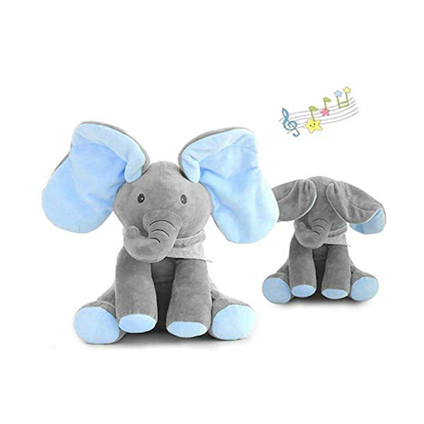 Jucarie Elefant Cucu-Bau, Virtual Trend®, canta si isi acopera capul cu urechile, 30 cm, Gri/Albastru