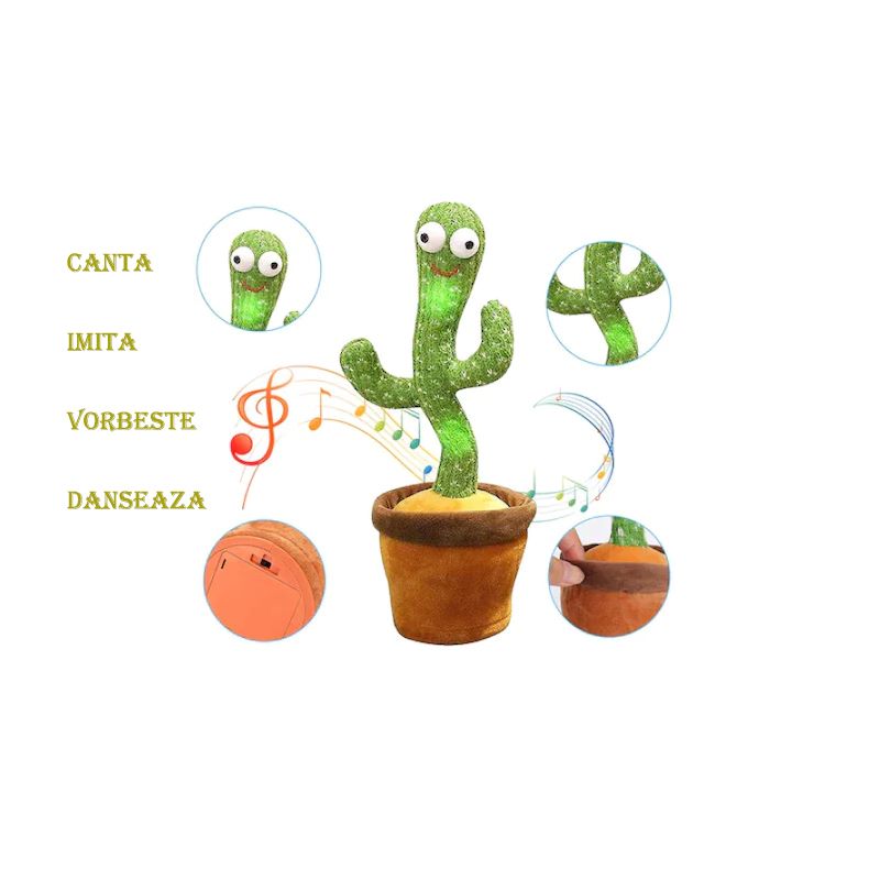 Cactusul de jucarie vorbitor si dansator Virtual Trend® – un companion interactiv si distractiv pentru toti iubitorii de jucarii interactive ce aduce zambete si veselie in viata copiilor si chiar a adultilor, gratie functiilor sale interactive. Acest cactus adorabil va fi un tovaras de nadejde si o sursa de amuzament pentru cei mici, aducandu-le ore intregi de joc si veselie. Aceasta jucarie interactiva are o multime de functii distractive pentru a tine copiii captivati. Cactusul vorbitor poate comunica cu cei mici printr-o voce vesela si amuzanta.